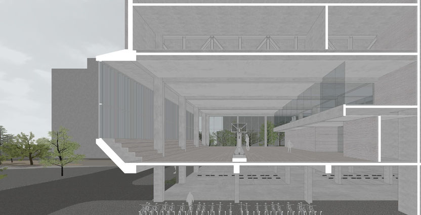 청소년수련시설과 체육시설을 분동으로 나누고, 나눠진 시설 사이로 동선을 연결하는데, 연결된 동선은 대지 동측 이면의 공원과 대지 서측 전면의 보행광장을 연결한다. 단면적으로도 중간레벨에서 서로다른 레벨의 외부환경을 연결하며, 외부와 내부의 보행계획을 혼합한다.